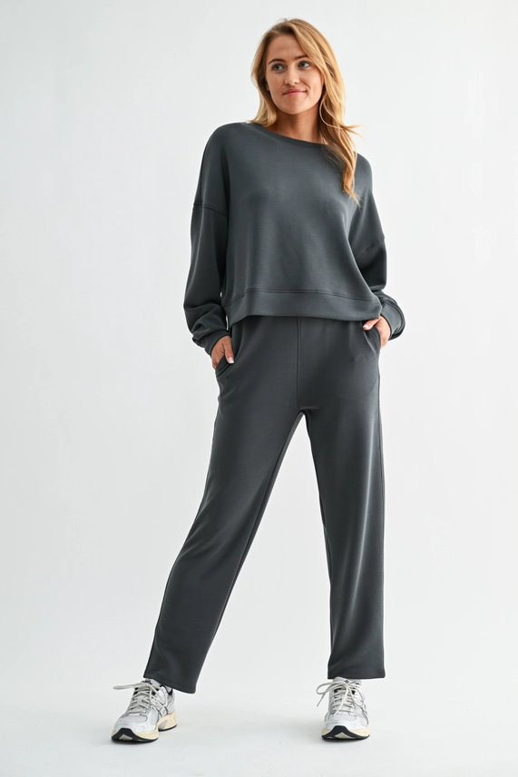 Meet your new favorite sweatshirt. Designed with a boxy-fit waistband for ultimate comfort, this sweatshirt feels as soft as butter and as light as a feather. The dropped shoulder design adds a touch of relaxed sophistication, making it perfect to pair with your favorite scuba pants or shorts. Elevate your casual wardrobe with this versatile piece that effortlessly combines style and coziness. Whether you're lounging at home or stepping out, this sweatshirt will be your go-to for a look that's put together yet undeniably comfortable.