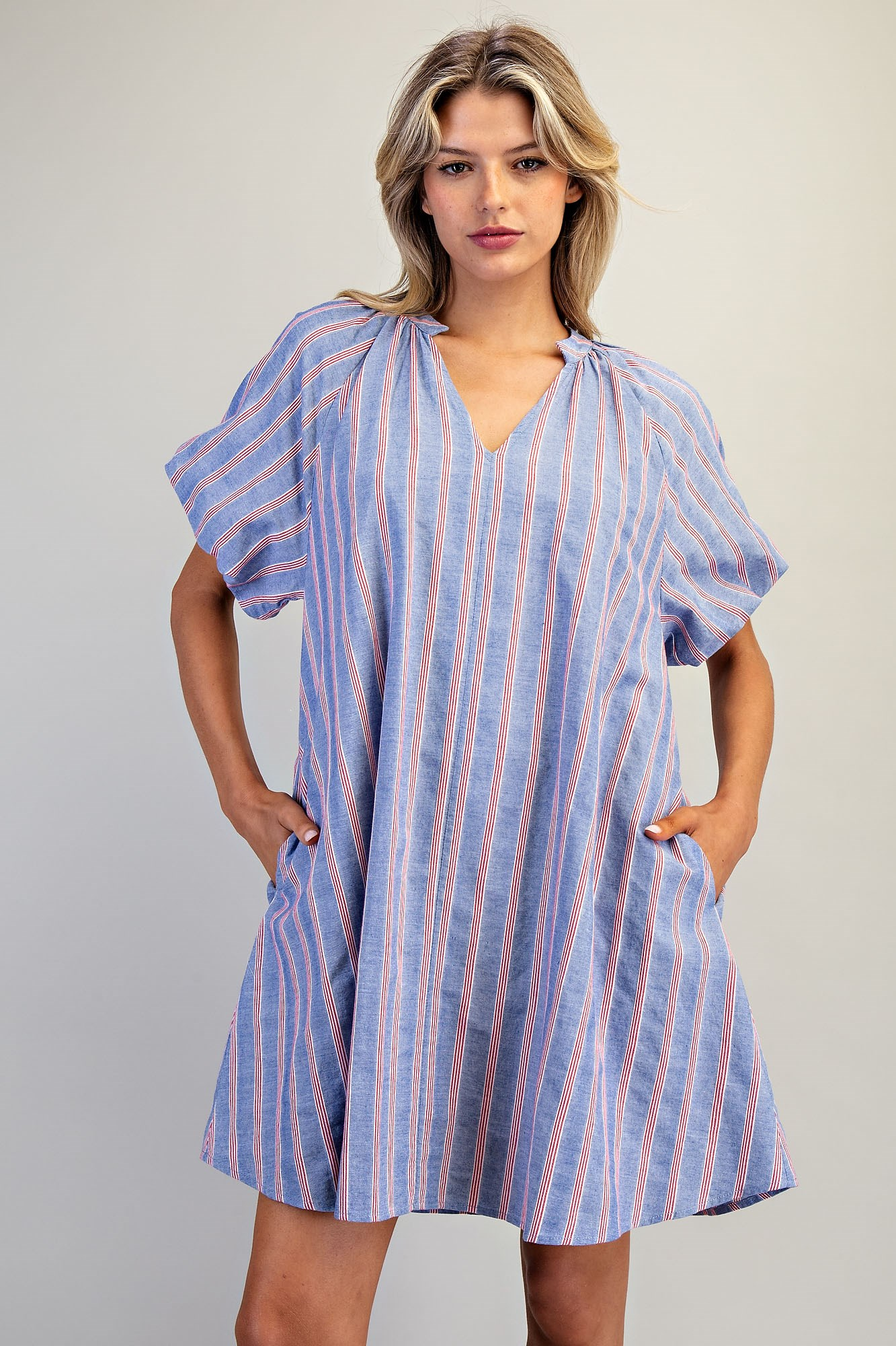 Meet your new throw-on-and-go favorite—the Allie Striped Denim Dress designed for comfort without sacrificing style. Featuring a softly gathered V-neckline and short puff sleeves with gentle volume, this dress strikes the perfect balance between playful and polished.