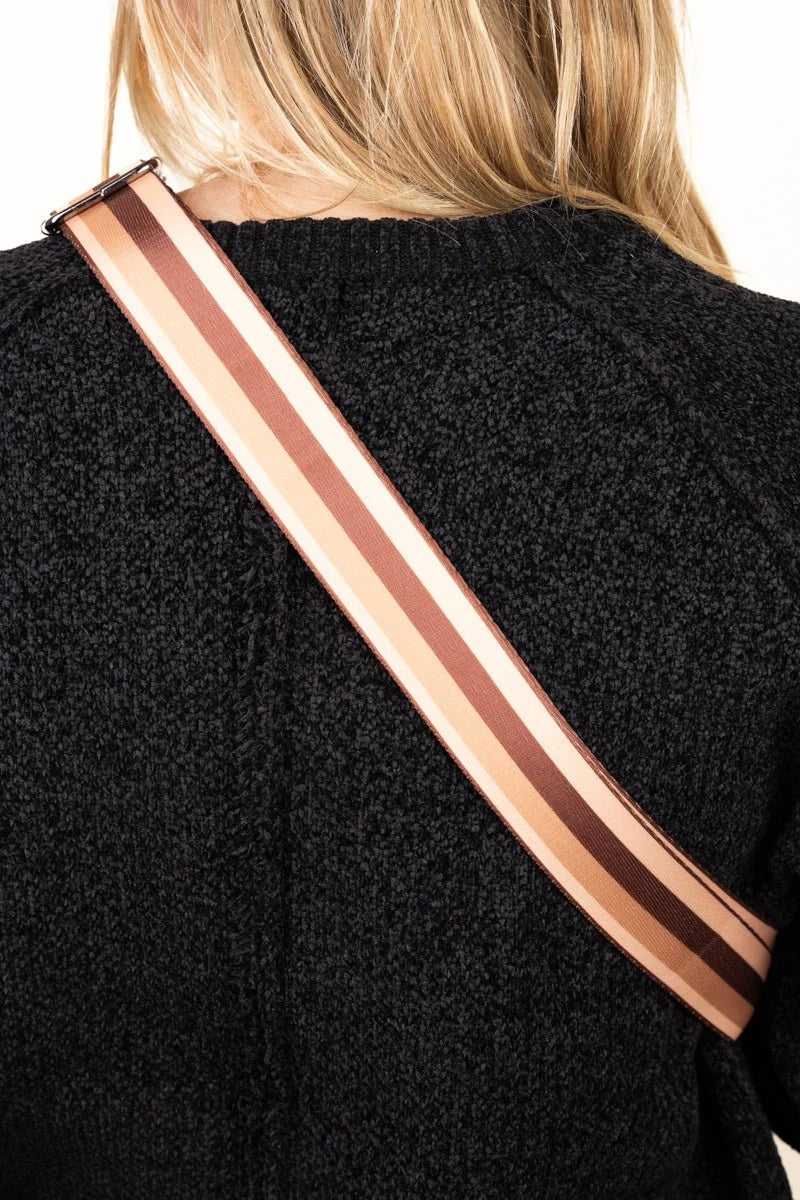 We're crushing on this new sling back style! The striped canvas strap makes it an unforgettable look. It's a classic style with an updated new twist. It features many options, such as an adjustable strap, bronze hardware and numerous pockets. This trendy sling bag is ideal for a few necessities and a must have accessory for any fashionista!