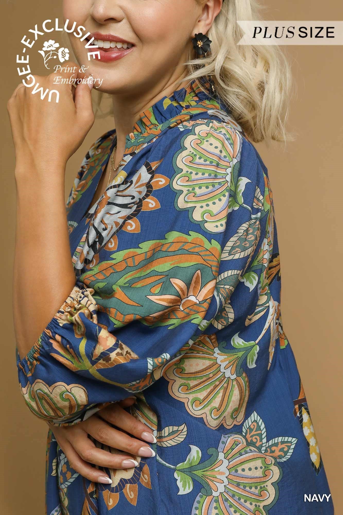 - Add this sweet dress to your wardrobe! With a super-cute floral print and a relaxed silhouette, this darling piece has a charming vibe. - Lightweight material with an abstract floral print featuring greens, blues and yellows - A v-cut neckline with a split detail featuring a ruffle border - ¾ length sleeves with elastic cuffs.