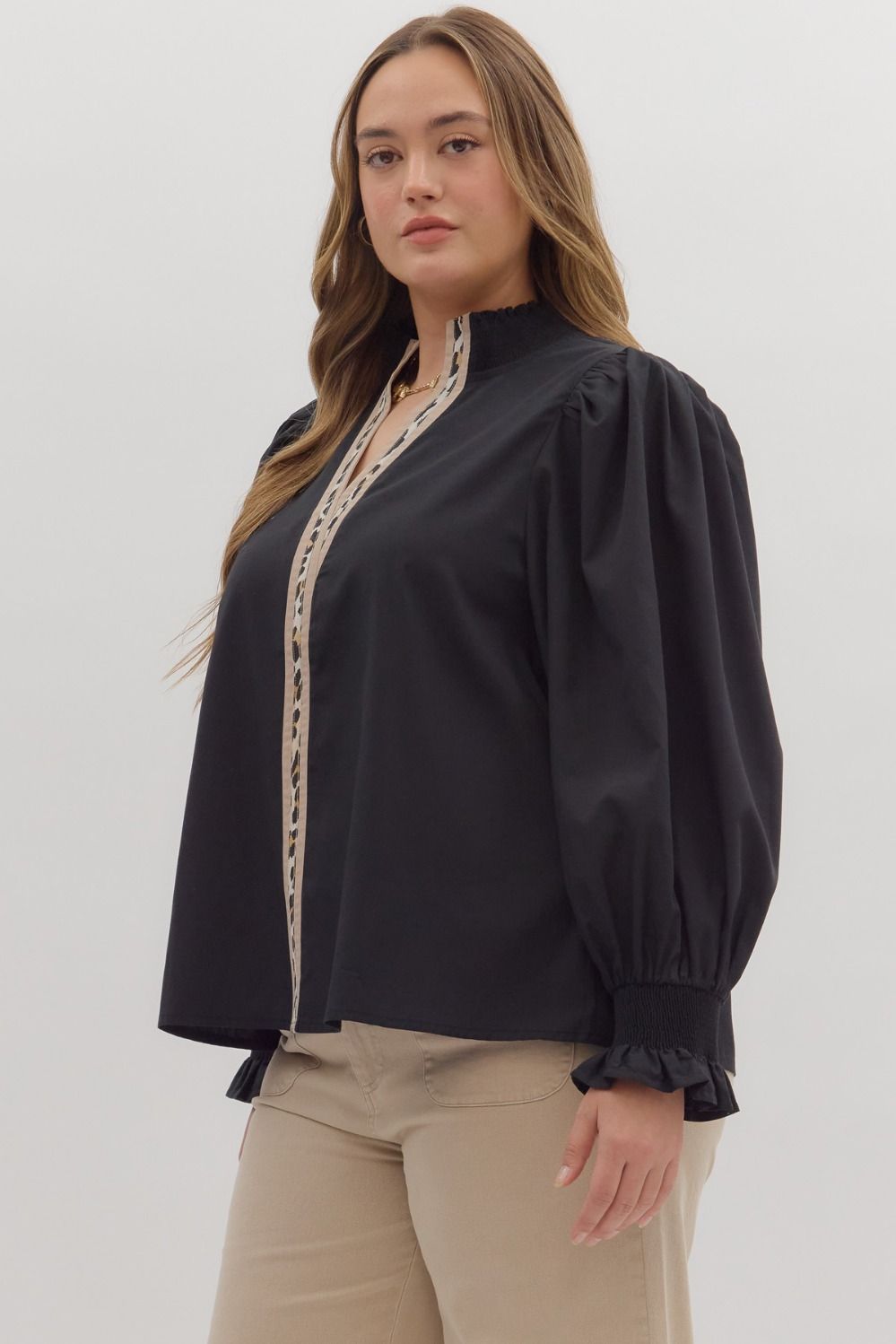 The winners only leopard trim top shines with long voluminous balloon sleeves and a high v-neckline, edged in wild animal print. Its crisp texture brings a fun, fresh vibe to your look. Pair her with your favorite jeans or slacks for an everyday essential outfit.
