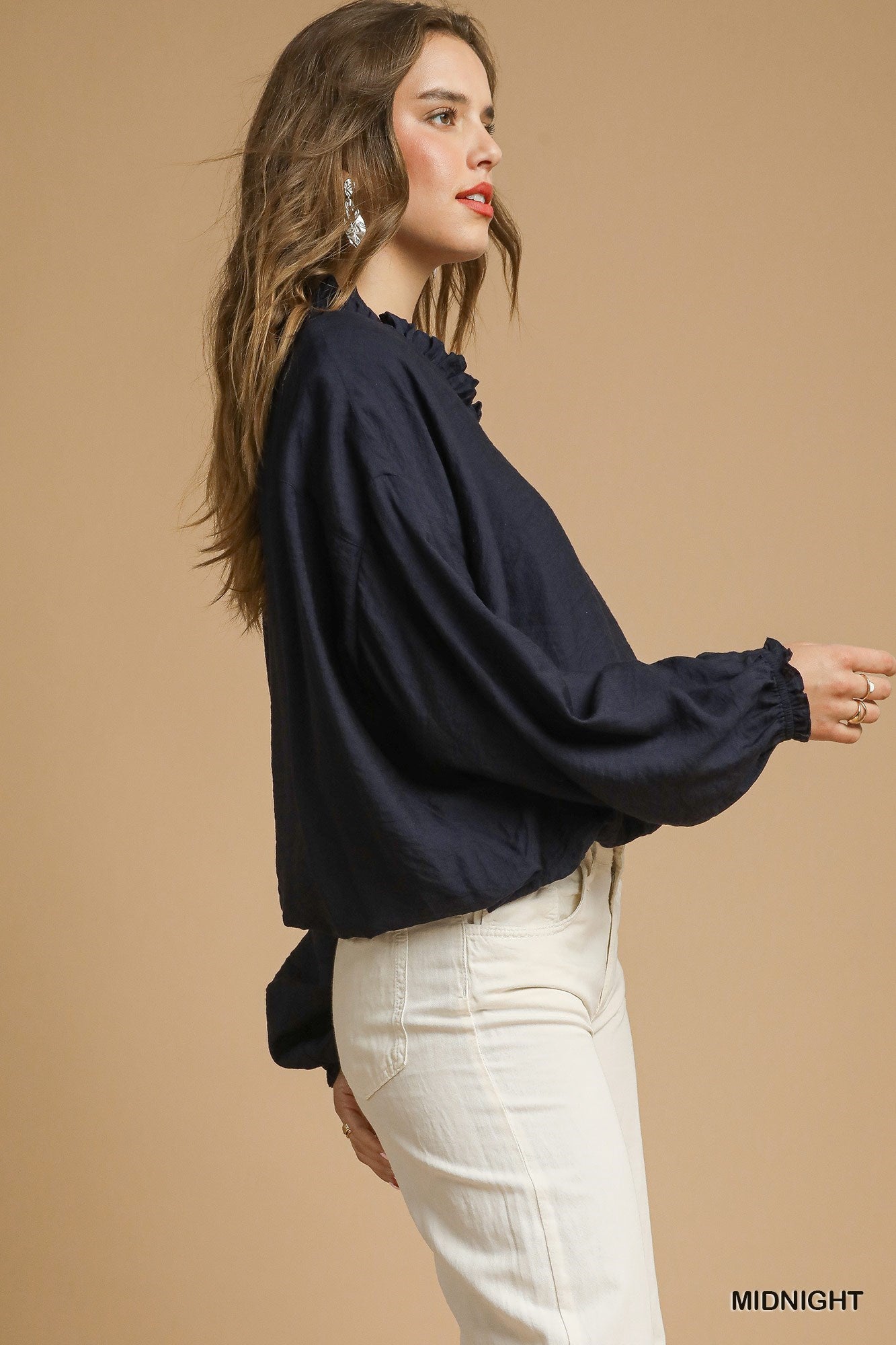 The Jules Bubble Hem Top features a flattering V-neck with delicate ruffle trim, adding a touch of elegance to your look. Its long sleeves with elastic cuffs and an elastic bubble hemline ensure a comfortable, secure fit throughout the day. Fully lined for smooth wear, this blouse combines style and comfort effortlessly. Style with neutral pants or casual jeans to make this statement top the standout piece